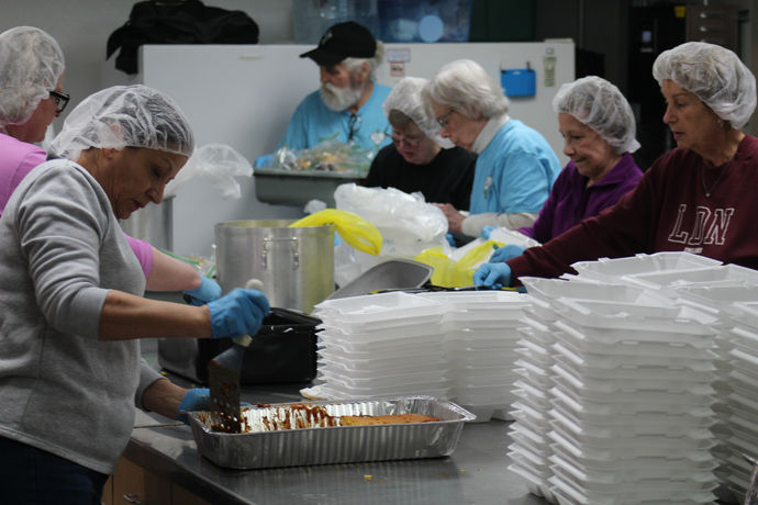 Each week, volunteers come together to cook, clean-up and pack homemade meals.